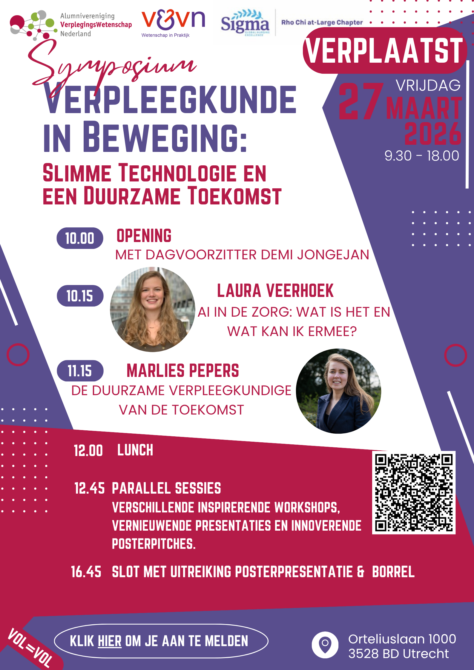 Wij nodigen je, samen met V&VN Wetenschap in Praktijk en Rho Chi at-large Chapter, graag uit voor het symposium: Verpleegkunde in Beweging: Slimme Technologieën en een Duurzame Toekomst.